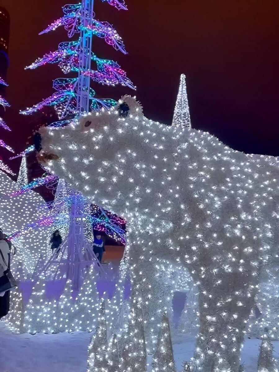В парк «Акведук» снова вернулась одна из самых уютных зимних традиций — большие световые медведи. В центре композиции — белая медведица с Умкой на льдине, по бокам — медвежата поменьше. Вечером фигуры красиво подсвечиваются и создают идеальную атмосферу для прогулки и зимних фотографий. 📍 Ростокинский акведук