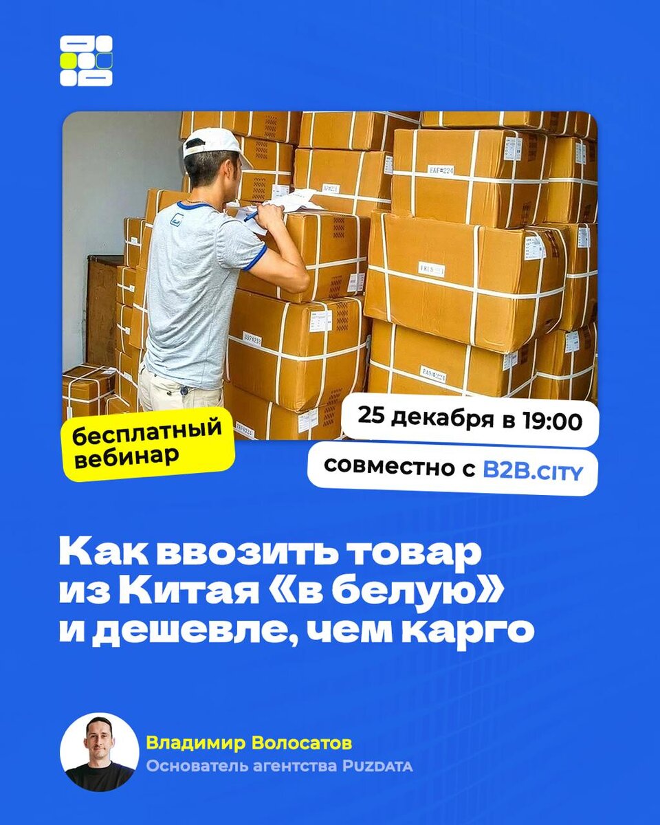! Напоминаем, что мы выходим в прямой эфир, чтобы обсудить «Как ввозить товар из Китая «в белую» и дешевле, чем карго». 👇 Что разберем: ✅ Какие легальные способы ввоза работают сейчас лучше всего? ✅ Как выглядит белый ввоз по шагам: без сказок и «серых» мест. ✅ Где чаще всего теряют деньги: ТН ВЭД, платежи, китайские поставщики. ✅ Контейнеры, сборные грузы, ввоз под контракт. ✅ Почему карго и «садовод» = контрафакт, и чем это заканчивается. 👀 25.12 в 19:00 (МСК) 🎙 Вебинар проведет Владимир Волосатов (Puzdata) совместно с B2B.city (ТЛК по доставке из Китая) 👉 Ссылку на вебинар пришлем перед вебинаром здесь — в нашем Телеграм-канале