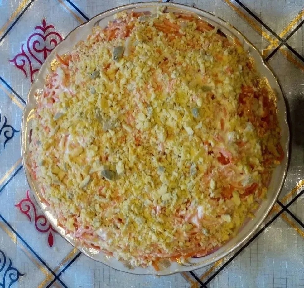 6. Сверху выкладываем морковь по-корейски, так же смазываем майонезом. Это будет шестой слой.