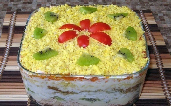 7 слой – оставшиеся желтки, перетертые на мелкую терку. Все слои промазываем майонезом. Приятного аппетита!