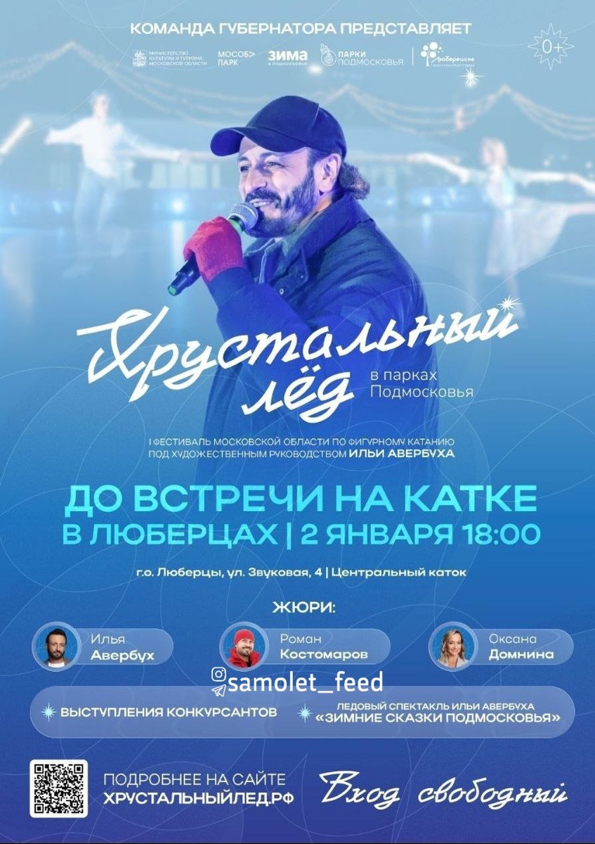 Илья Авербух, Роман Костомаров, Оксана Домнина и сильнейшие фигуристы округа - фестиваль «Хрустальный лёд» пройдёт в Люберцах 2 января. Конкурсанты будут выступать в четырех номинациях: «Одиночное мужское катание»; «Одиночное женское катание»; «Танцы в паре»; «Групповое катание». Выступления конкурсантов вместе с Ильей Авербухом будут оценивать Оксана Домнина и Роман Костомаров, чемпионы мира по фигурному катанию, заслуженные мастера спорта России. Люберцы встретят участников фестиваля 2 января на Центральном катке. ________ Присылать новость @mstislavz 👉 Обсудить в чате ЖК 👉 Подписаться на канал 📲 Мы в MAX