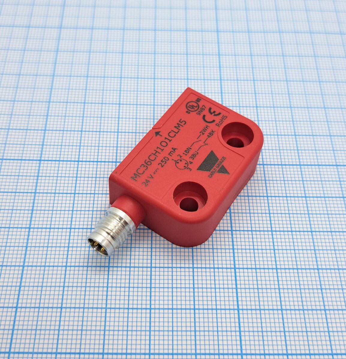 MC36CH1O1CLM5L — компактный индуктивный датчик безопасности от итальянского производителя Carlo Gavazzi. Прибор предназначен для контроля положения подвижных защитных ограждений (распашных, сдвижных, съёмных) в промышленном оборудовании. Обеспечивает остановку опасных движений при открытии или смещении защитных элементов. 1. Тип сенсора: индуктивный, магнитно‑кодированный (Reed‑контакт). 2.Конфигурация выходов: - 1 нормально открытый контакт (NO); - 1 нормально закрытый контакт (NC). 3. Рабочее напряжение: 12−24 В AC/DC. 4. Рабочий ток: 250мА . 5. Рабочая температура: от -25 до +80°C. 6. Материал корпуса: усиленный полимер (PBT). Датчик используется в системах безопасности промышленного оборудования: 1. Высокий уровень безопасности: соответствует категории 4, PL e по EN ISO 13849‑1 (при использовании с подходящим логическим модулем безопасности). 2. Компактность: габариты всего 49x26x13мм. 3. Защита от внешних воздействий: степень защиты IP67 (пыле- и влагонепроницаемость). 4. Устойчив
