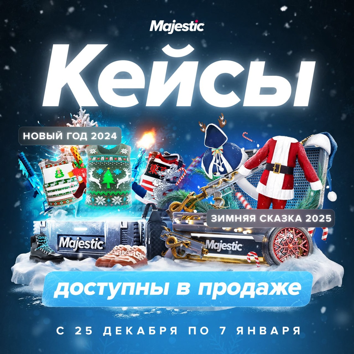 Новый год ближе — и сюрпризов больше! С 25 декабря кейсы «Новый год 2024» и «Зимняя сказка 2025» станут доступны. 😱 А внутри — Porsche Carrera 911, Infiniti Q60S, эксклюзивная зимняя и новогодняя одежда, аксессуары и многое другое. До 7 января пополняйте коллекции со скидкой 10% и наслаждайтесь атмосферой праздника вместе с нами! ❤️ Majestic Role Play