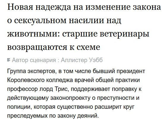 Хотя современного человека удивить сложно, но... Принял решение написать о том, и такие события могут происходить. Сделал скрин, чтобы полностью не обрабатывать такой "материал." "Благородные" английские люди очень любят учить остальной мир как жить, чтут традиции и монархические устои... И тут английские ветеринарные врачи подняли свой голос против (сексуального!!!) насилия над животными. Предлагается расширить список (зоофильных извращений) деяний подлежащий законодательному преследованию. ВАЖНО поблагодарить наших коллег за такую гражданскую и профессиональную позицию в мире "либеральных ценностей." Понятно и причина этого. Именно, к ветврачам попадают животные после всего этого...Киплинг предполагал такие аспекты "бремени белого человека?"