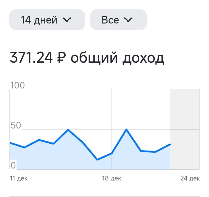 За две недели у меня вот такой доход сейчас, это с 11 по 24 декабря, 371 рубль, 24 копеечки.