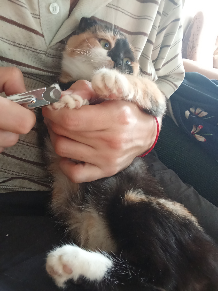 Назвали мы малышку Ноябринка- Мандаринка, ей от силы 3 месяца. Этот ребенок бродил по улице и бегал за всеми ногами прохожих, никто не обращал на неё внимание, рядом дорога по которой ездят машины " Никому ненужный "истощенный ребенок -котенок.