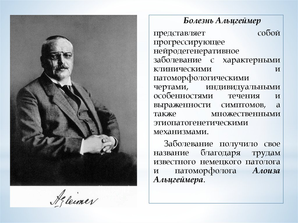 Алоис Альцгеймер – немецкий психиатр и невролог, который первым описал эту болезнь. Работал в психиатрических клиниках, где заинтересовался органическими причинами психических расстройств. Его имя теперь знают во всём мире, хотя при жизни он и не подозревал, насколько важным окажется его открытие. 1. Амилоидные бляшки – скопления белка, разрушающие нейроны. 2. Нейрофибриллярные клубки – спутанные волокна внутри нервных клеток. Этот случай стал предметом тщательного патологоанатомического исследования после смерти пациентки в 1906 году. Эмиль Крепелин (1856–1926) —выдающийся немецкий психиатр, основоположник современной классификации психических расстройств. Ввёл понятие "болезнь Альцгеймера" (1908), выделив её как отдельное заболевание. Основал *Немецкий исследовательский институт психиатрии* (1917), ныне "Институт психиатрии Общества Макса Планка" Его классификации легли в основу современных диагностических систем (МКБ)