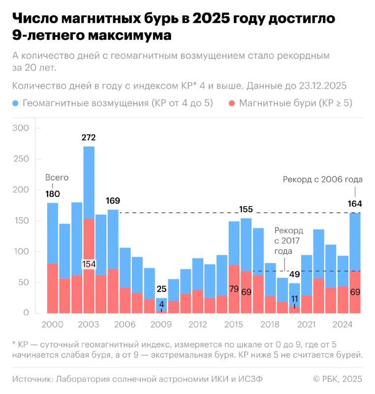 2025 год оказался рекордным по количеству магнитных бурь за последние девять лет — их было 69 за 365 дней