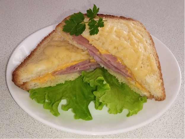 Приготовить просто и быстро, а семья довольна. Ингредиенты: - тостовый хлеб – 18 кусочков; - ветчина – 18 кусочков; - плавленый сыр, тостовый – 9 кусочков; - сыр твердых сортов – примерно 40 гр. Для яично-молочной смеси: - яйца - 3-4 шт.; - молоко – 150 мл.; - соль – по вкусу. Ветчину нарезать. В емкости взбить вилкой яйца, добавить соль, молоко, перемешать. Сыр твердых сортов натереть на терке. Девять ломтиков хлеба обмакнуть в яично-молочной смеси, разложить на смазанный растительным маслом противень. Сверху добавить по два ломтика ветчины. Плавленый сыр девять кусочков. Сверху закрыть кусочками тостового хлеба смоченного в яично-молочной смеси, при желании посыпать натертым сыром. Запекать в разогретой духовке до 180 гр. примерно 10 минут. Сыр должен только расплавиться, но не приобрести золотистую корочку иначе бутерброды будут суховатыми. Приятного аппетита.