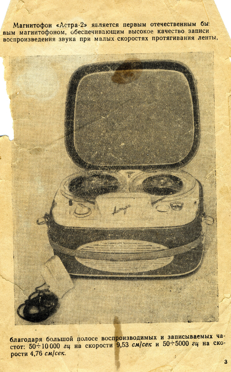 Представляю вашему вниманию инструкцию по эксплуатации магнитофона "Астра-2" производство Ленинградского завода "Техприбор".Был у меня такой магнитофон,но увы,осталась от него лишь инструкция и корпус (внутренности я частично выкинул,частично для чего то использовал,не помню уже),деревянный ,прочный!Интересна история появления этого магнитофона у меня..Я еще ходил в школу ,когда в один прекрасный майский день нам позвонила мамина подруга(живущая по соседству) и предложила мне этот магнитофон (ну т.е. она спросила не нужен ли мне ,я конечно же ответил "Да!")и вот я уже иду в соседний дом за магнитофоном .Мамина подруга отдала мне с магнитофоном и микрофон и необходимые шнуры и целый пакет с пленками ,их там было не меньше 20 штук ,в основном номер 18...Дело в том,что она купила сыну новый магнитофон ,а этот решила отдать мне (ну вот такая добрая женщина). В этот же вечер мы с отцом принялись налаживать "Астру"(в том доме она долгое время стояла без дела)..Смазали где нужно,почистили ,по