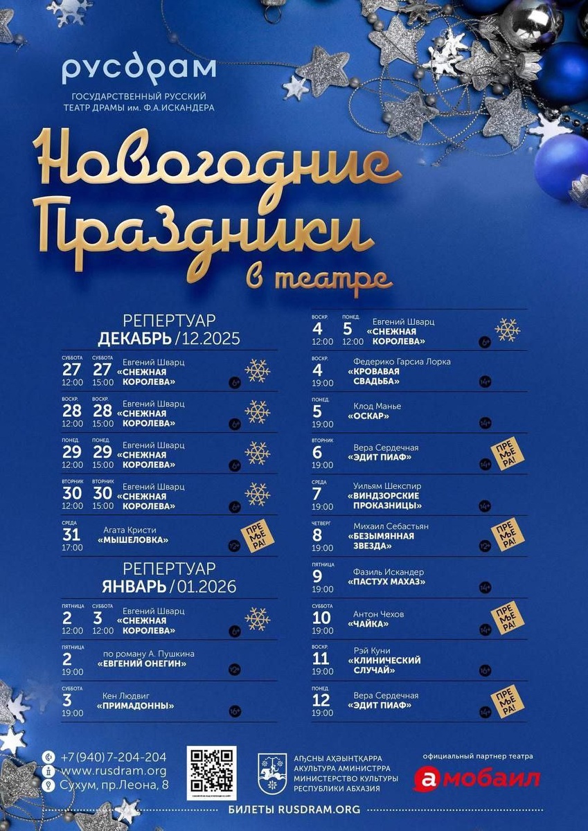 😉💙 Сохраняйте афишу Русдрама в Сухуме на новогодние праздники. Сколько премьер в театре🔥 Обратите внимание на "Эдит Пиаф". Это восторг!!! Билеты на сайте театра. Разлетаются, кстати, как пирожки горячие. @mao_tour #сухум #афиша