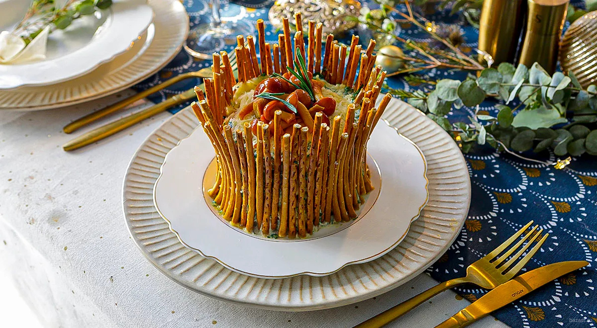 Салат «Грибная полянка» — изысканное украшение праздничного стола. Основу составляют шампиньоны и маринованные опята, курица придает блюду нежность и сытность, а зелень украшает внешний вид. Простота приготовления заключается в аккуратной укладке слоев в кулинарное кольцо и выдерживании под прессом для сохранения формы и насыщенности вкуса. Украсить салат можно соломкой или зеленью, важно лишь подчеркнуть эстетику блюда. Идеален для желающих приятно удивить гостей. ИНГРЕДИЕНТЫ НА 6 ПОРЦИЙ Шампиньоны свежие 300 г Курица копченая 200 г Яйцо куриное 3 шт. Сыр полутвердый 100 г Майонез 150 г Зелень 2 веточка(и) Чеснок 1 зубчик(а) Масло растительное рафинированное 1 ст.л. Соль по вкусу Перец чёрный молотый по вкусу Для подачи: Соломка солёная по вкусу Опята маринованные по вкусу Розмарин по вкусу Подготовьте ингредиенты для салата «Грибная полянка» с шампиньонами и маринованными опятами. Нарежьте шампиньоны тонкими пластинками. Поджарьте на растительном масле до полного испарения жидкости