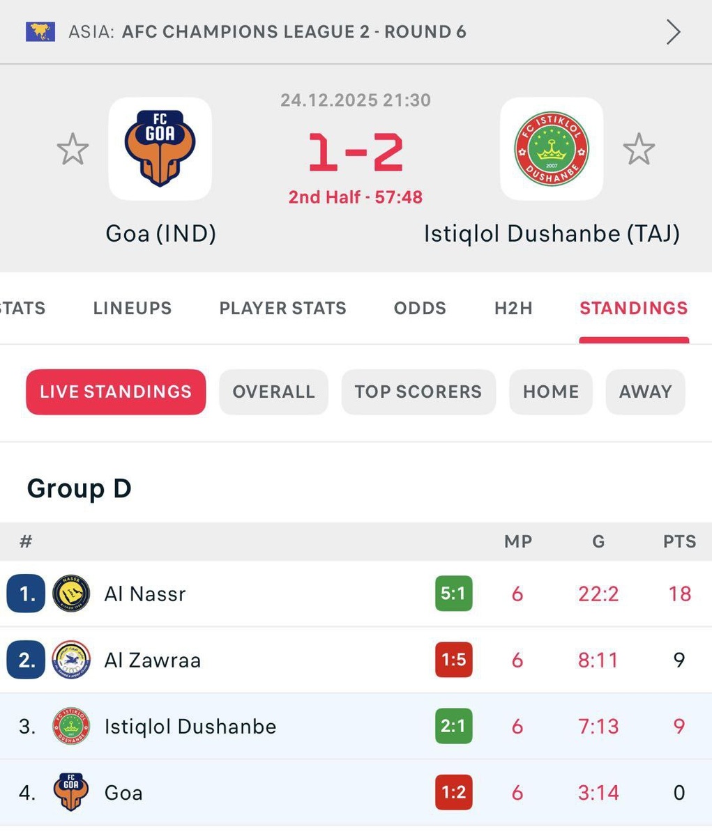 🇹🇯⚽️ "Истиклол" одержал победу над индийским Гоа, но этого оказалось недостаточно для выхода в плей-офф. В параллельном матче "Аль-Наср" уверенно разобрался с "Аль-Завраа", победив 5:1. Для выхода дальше «Истиклолу» нужно было забивать больше.