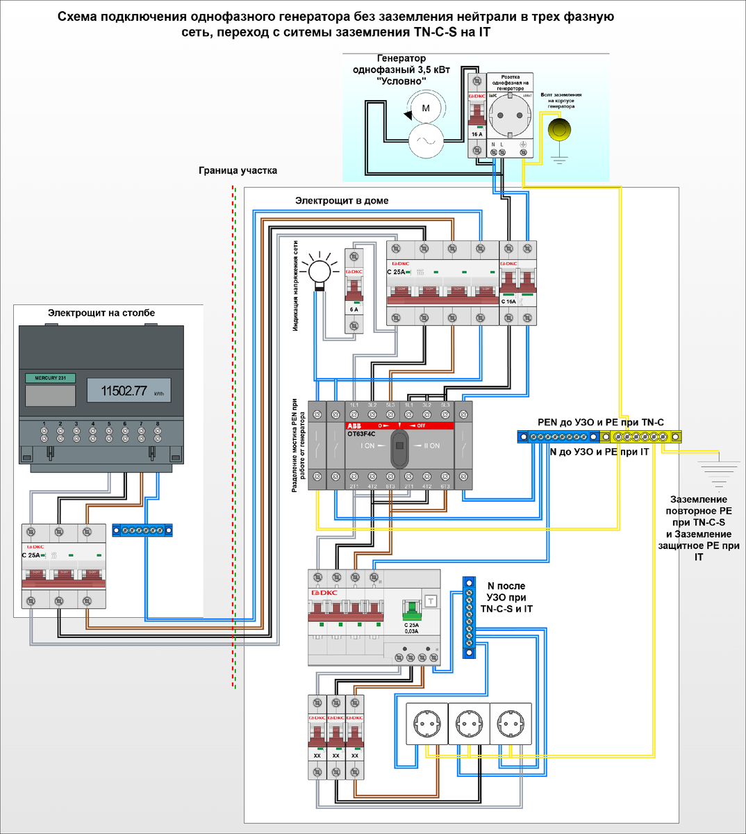 - Физический разрыв связи с сетевым PEN при работе от генератора (п.1.7.76 ПУЭ)