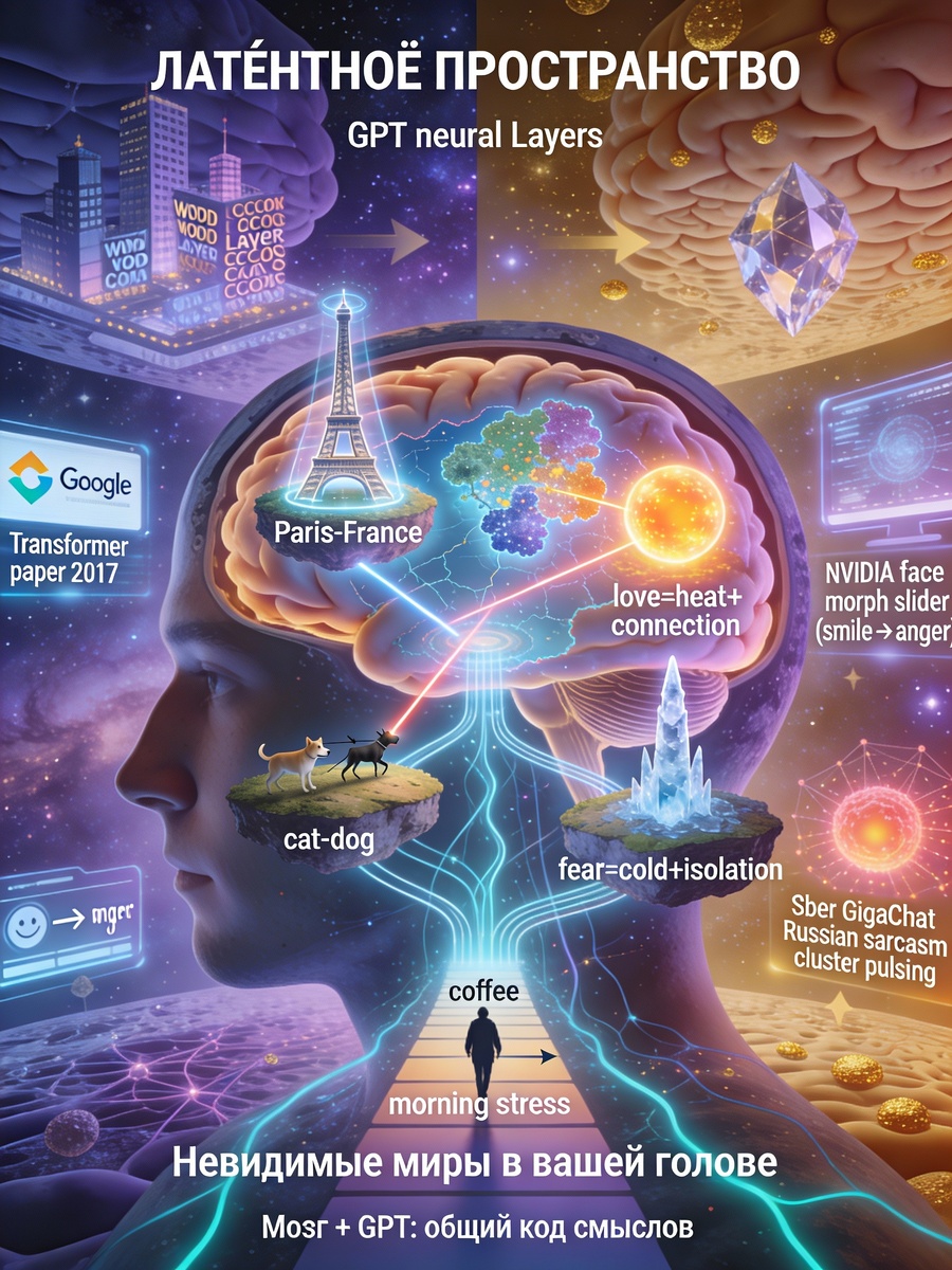 Вы когда-нибудь ловили себя на мысли: "Как я мгновенно понял шутку без слов?" Мозг не ищет определения — он "видит" связи в невидимом пространстве смыслов. То же самое делает GPT. Латентное пространство — скрытый слой, где рождаются идеи. Google Brain (2017) открыло: ИИ создаёт "внутренние миры", где "кошка" рядом с "собакой", а "страх" — напротив "радости". Простыми словами: представьте 1000-мерное пространство, где данные сжимаются в точки. Близкие по смыслу — рядом, далёкие — на расстоянии. Эмбеддинг "Paris" рядом с "France", но далеко от "pizza". Трансформеры (Google 2017): каждый слой нейросети строит новое пространство. Первый — слова. Десятый — абстрактные понятия: "любовь=тепло+связь". Attention-механизм моделирует кору мозга: фокусируется на связях. Визуализация: t-SNE показывает кластеры. Кошки в одном углу, собаки — рядом. Интерполяция: иди по оси — кошка → собака → волк. NVIDIA (2018): плавные переходы лиц — от улыбки к гневу. Эмерджентность (статья 11) рождает интеллект