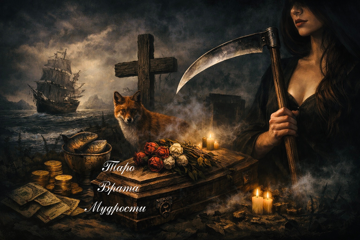 Вот она, самая жестокая правда этого расклада. Букет это подарки, комплименты, улыбки, знаки внимания, красивые слова, маленькие радости. Букет это то, что он вам показывает: «Смотри, я забочусь, я рядом, я стараюсь, всё хорошо». Гроб это конец. Полный, окончательный, безапелляционный. Гроб это то, что уже умерло, похоронено, закрыто. Гроб это финал, от которого не убежишь.