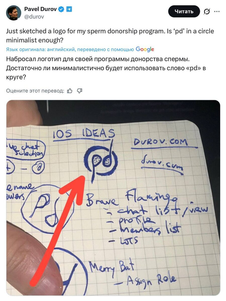 *. Основатель Telegram опубликовал в X логотип своей программы донорства спермы с буквами «PD» (Pavel Durov). Французский пользователь отметил, что «PD» на французском сленге означает «гей»*. В ответ Дуров написал: «Значит это будет негейский проект, который будет выдавать себя за гейский. Как президент Франции — только наоборот». * Движение ЛГБТ признано экстремистским и запрещено в РФ. Заря | Новости - Подписаться