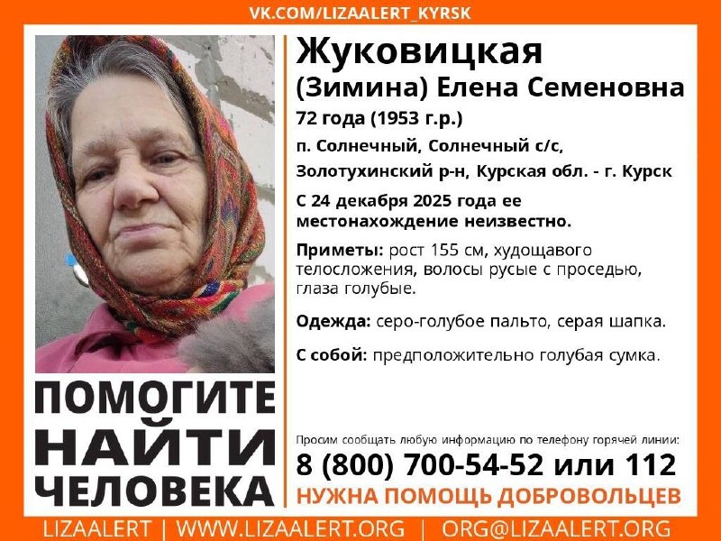 Поисковый отряд «ЛизаАлерт Курская область» объявил сбор добровольцев для поиска пропавшей 72-летней Елены Жуковицкой (Зиминой). В настоящий момент о мете нахождения женщины ничего неизвестно. Приметы пропавшей: - рост - 1,55 метра; - телосложение - худощавое; - волосы - русые с проседью; - глаза - голубые. Женщина одета в серо-голубое пальто и серую шапку. Предположительно, у неё с собой голубая сумка. Поисковики созывают на помощь волотнёров, а всех, кто обладает какой-нибудь информацией о пропавшей просят позвонить по телефонам 8-800-700-54-52 или 112.