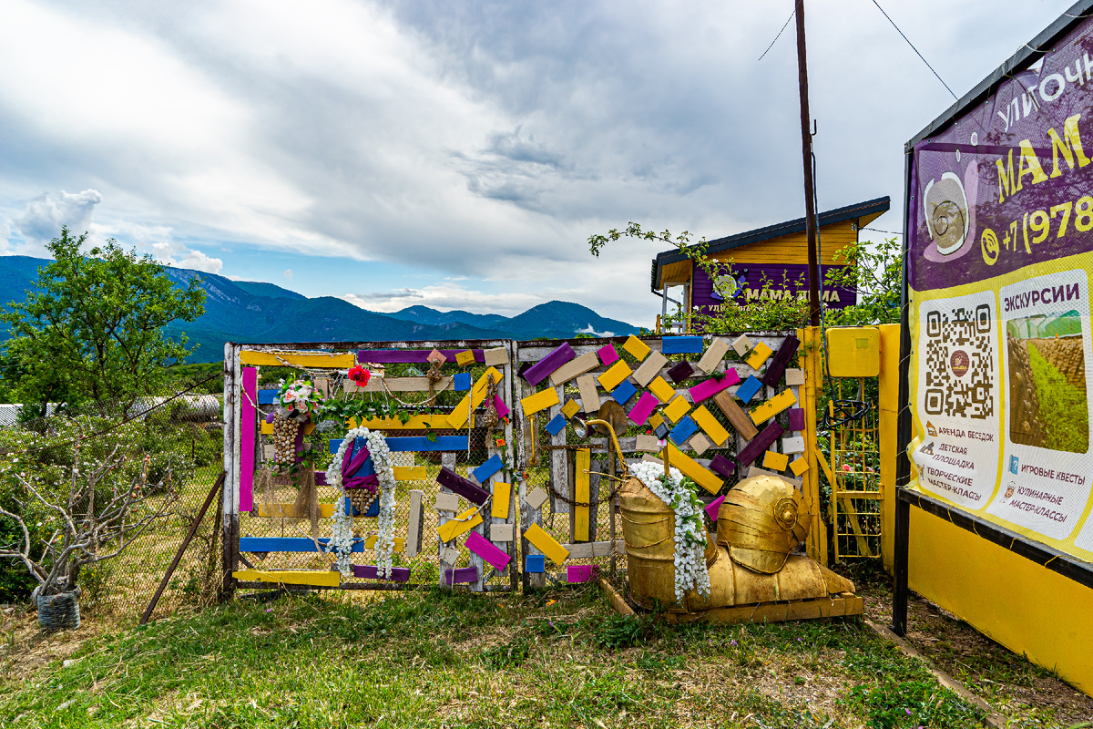 Но не буду излишне медоточив. При всех перечисленных интересных особенностях этого места, инфраструктура для туристов пока совсем простенькая. Никакого особенного дизайна и лоска нет. Можно сказать инфраструктуры этой нет совсем – просто территория деревенского огорода, ну да зеленая, ну да с цветами, но коль уже если объект заявлен, как туристический, а не просто ресторан, коль здесь проводится платная (и недешевая!) экскурсия, то над этим надо как-то работать.