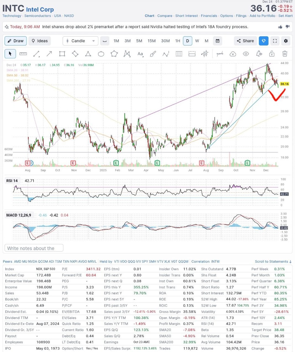 ? Intel #INTC сегодня в начале проседал на 4% но к концу торгов просадку успешно выкупили. Появился отчет, что Nvidia поставила на паузу тесты их производственного процесса для своих передовых чипов. Короче, Nvidia пока не готова заказывать производство у Intel, и это нервирует рынок. Для Intel это серьезный удар по амбициям их foundry-бизнеса (IFS). Получить Nvidia в клиенты — это была бы валидация всей стратегии Пэта Гелсингера и доказательство конкурентоспособности с TSMC. Эта новость ставит под сомнение их технологическую готовность и способность выполнять дорожную карту в срок. На мой взгляд, это не конец истории, а отрезвляющий момент. Рынок справедливо переоценивает риски в turnaround-кейсе Intel. Пока IFS не покажет реальный крупный контракт, сомнения могут давить на котировки. #Intel #Nvidia #полупроводники