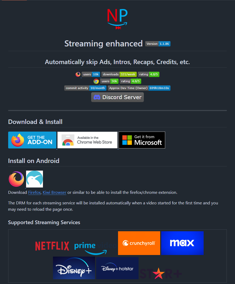 Netflix-Prime-Auto-Skip - это расширение для браузера, предназначенное для автоматического пропуска рекламы, вступительных титров, повторов и финальных титров на популярных стриминговых сервисах, таких как Netflix, Prime Video, Disney+, Crunchyroll и HBO Max. Расширение позволяет значительно улучшить пользовательский опыт, избавляя от рутинных действий при просмотре контента. * Автоматический пропуск: Мгновенно пропускает рекламу, заставки (Intros), краткие повторы прошлых серий (Recaps) и финальные титры на всех поддерживаемых платформах. * Умный выбор профиля: Запоминает и автоматически выбирает последний использованный профиль на Netflix и Crunchyroll. * Контроль воспроизведения: Добавляет настраиваемое управление скоростью воспроизведения (горячие клавиши S и D) и возможность автоматического запуска видео в полноэкранном режиме. * Отображение рейтингов: Интегрирует рейтинги TMDB (The Movie Database) для всех шоу и фильмов непосредственно в интерфейс сервисов. * Оптимизация интерфей