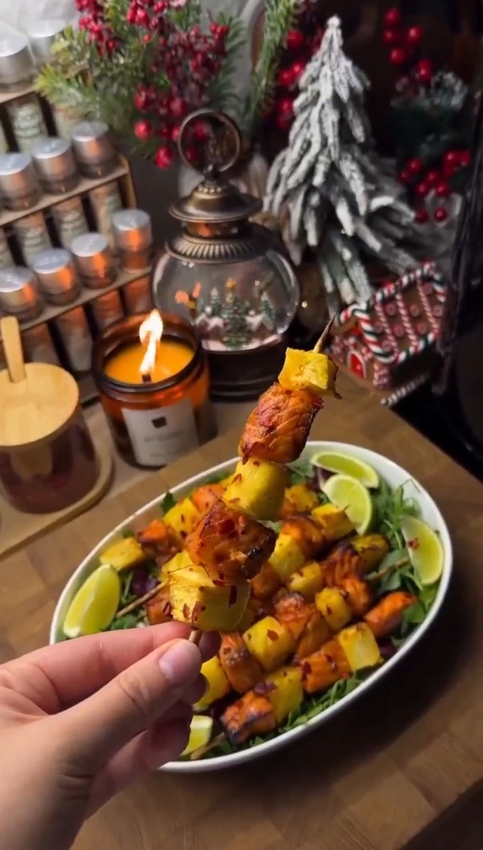 Фаворит на моем праздничном столе — вот эти аппетитные шашлычки из лосося с ананасом.