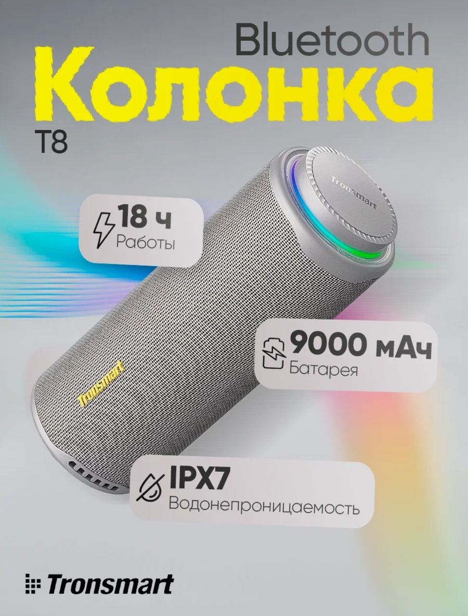 Tronsmart T8 — это портативная беспроводная колонка, выпущенная в 2025 году. Она предназначена для использования на природе, в путешествиях и в повседневной жизни. Колонка обеспечивает объёмный звук на 360° с акцентом на низкие и средние частоты, а также поддерживает различные способы подключения.