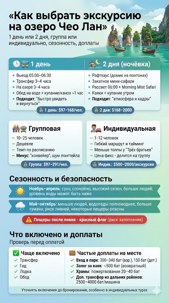 На что обратить внимание: это дорогой сегмент, и стоит знать, за что платите. Разница с групповым 2-дневным туром ($168) — в уровне сервиса, приватности и гибкости, а не в «другом озере». Скалы, вода и джунгли те же. Платите за то, что можете встретить рассвет без толпы из пяти лодок, остановиться на час в тихой бухте, где никого нет, и не привязываться к темпу группы. Если для вас это критично (особенно с детьми или пожилыми родителями), цена оправдана. Если главное — просто «увидеть Чео Лан», групповой вариант закроет задачу в 10 раз дешевле.