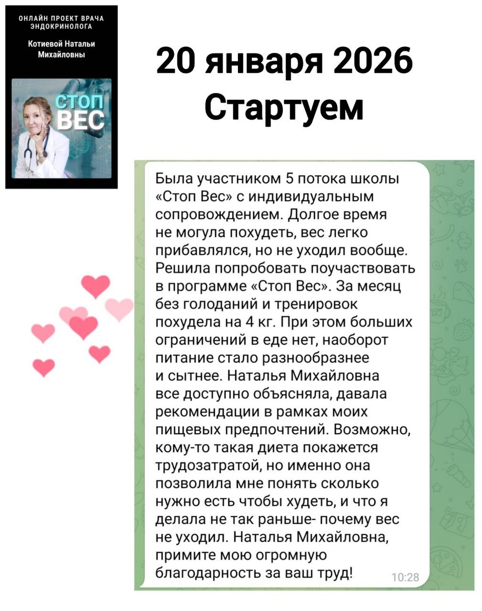 ☕️ С чего бы я посоветовала начать свой путь в снижении веса : ✔️Пересмотрите информацию на моем канале. ✔️Запишитесь на консультацию очную или онлайн (ссылка в шапке профиля). ✔️Если готовы к пути равному подъему в гору с флагом победы, жду вас в Школу СтопВес. Будте в первом потоке 2026, стартуем 20 января. Забронировать можно по ссылке https://kotievadoc.ru/stopves Стоимость за 7 недель работы: - 10 000 ₽ групповой формат - 20 000 ₽ группа-индивид формат - 30% скидка выпускникам школы - 5000 ₽ за составление индивидуального меню на 7 дней. И ещё много чего интересного 🙂 Я вас жду ❤️