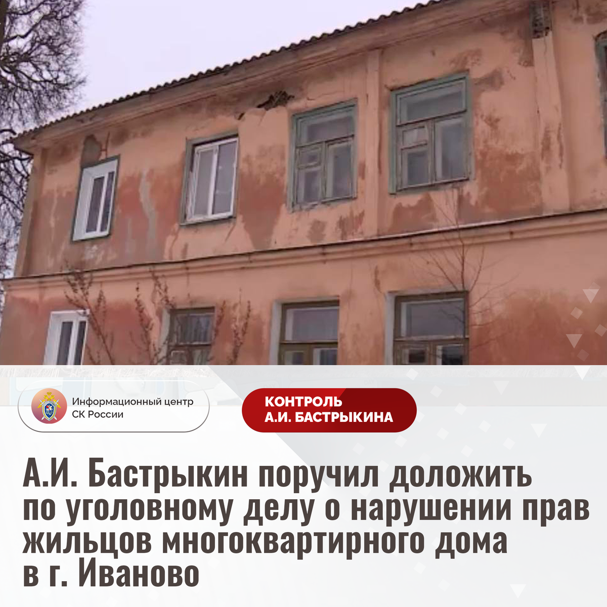 А.И. Бастрыкин поручил доложить по уголовному делу о нарушении прав жильцов многоквартирного дома в г. Иваново В сети Интернет сообщается о ненадлежащем обслуживании и содержании многоквартирного дома на улице Чехова в городе Иваново. В здании 1957 года постройки разрушается фасад, в стенах образовались трещины, конструкции прогнили, кровля деформирована, из-за чего в период выпадения осадков затапливаются жилые помещения и образуется повышенная влажность. Несмотря на имеющиеся нарушения и ежемесячное внесение гражданами коммунальных платежей, строение исключено из программы капитального ремонта. В связи с этим жильцы вынуждены за свой счет проводить монтажные работы. Обращения в различные инстанции результатов не принесли. В СУ СК России по Ивановской области возбуждено уголовное дело. Председатель Следственного комитета Российской Федерации Александр Иванович Бастрыкин поручил руководителю СУ СК России по Ивановской области Дмитрию Аркадьевичу Позовскому представить доклад о предвари