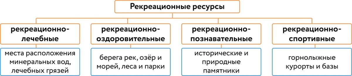 В начале XXI в. рекреационные ресурсы вошли в число востребованных. Однако их использование зависит от уровня развития сферы услуг того или иного государства. Рекреационные ресурсы — это природные и антропогенные объекты, которые можно использовать для отдыха, туризма и лечения. Главное назначение рекреационных ресурсов — поддерживать физические силы и эмоциональный настрой человека, сохранять его здоровье и духовно его обогащать. Рекреационные ресурсы Объекты и явления природы, используемые для отдыха, туризма и лечения, объединяют в группу природно-рекреационных ресурсов. Это морские побережья с благоприятным климатом, берега рек и озёр, горы, лесные массивы, минеральные источники, лечебные грязи. К основным формам природно-рекреационных территорий также относят зелёные зоны вокруг больших городов, заповедники, национальные парки. Достопримечательности городов, памятники истории, археологии, архитектуры и искусства, используемые для посещения туристами, — составная часть культурно-и