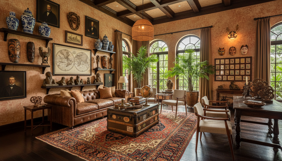 Будь то имитация коллекции любителя шинуазри, этакого Тадеуша Шолто, галереи сувениров из бурной молодости африканского плантатора или «кабинета редкостей» профессора-завсегдатая полинезийских экспедиций, всяческие артефакты — ключевой элемент, даже если он изготовлен с полгода назад и куплен в магазине декора. В зависимости от разновидности стиля это могут быть: