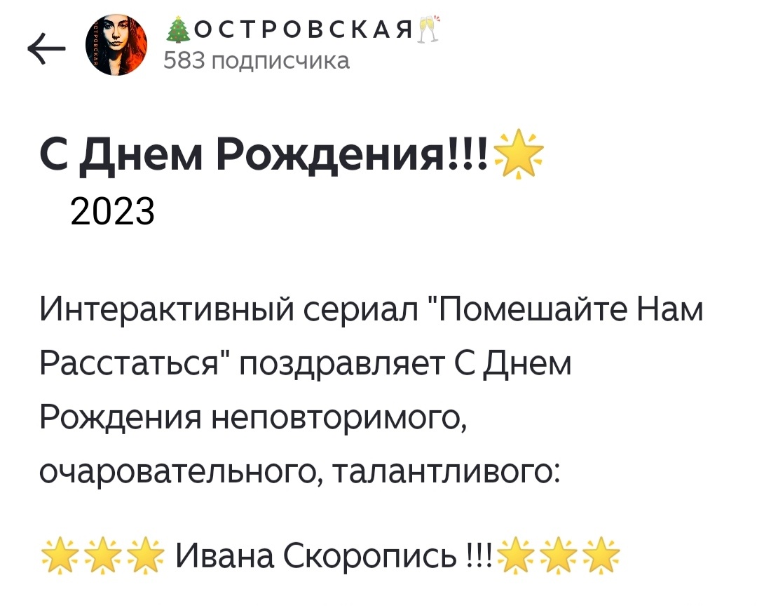 К сожалению, Иван так и не узнал о поздравлении, так как Интересантом Островской не является и Салон не посещает. В связи с чем, роль в иммерсиве вакантна.