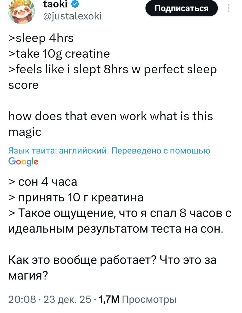 Научное объяснение чудо-свойствам добавки следующее: 🔴 При дефиците сна сильно снижается энергетический баланс в мозге и мышцах. 🔴 Креатин быстро восстанавливает АТФ (энергетический аккумулятор в клетках). 🔴 Добавка ускоряет восстановление нервной системы во сне, повышая устойчивость к стрессу и нагрузкам. 🔴 Улучшаются когнитивные функции, бодрость после недосыпа; люди отмечают «второе дыхание». Отправляйте тем, кому кофе уже не помогает 😳 CtrlAltDelights- подписаться