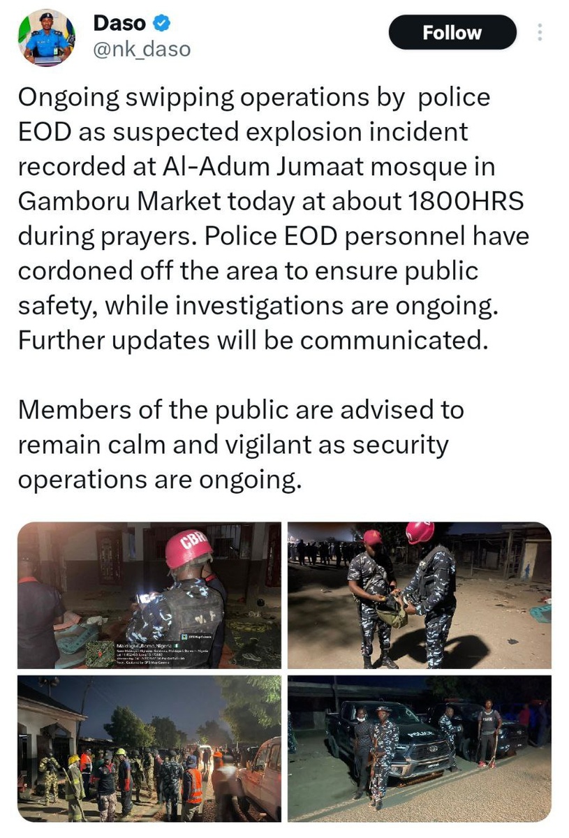Official police spox CONFIRMS 'suspected explosion' at northeast Nigeria mosque