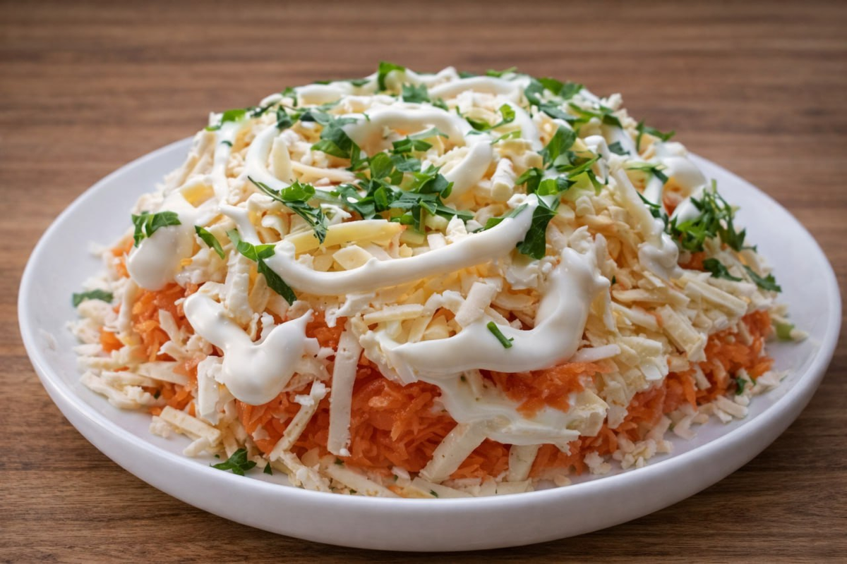 Здравствуйте, мои хорошие! Есть такие блюда, которые не нуждаются ни в украшениях, ни в сложных подачах. Они просто появляются на столе — и сразу становится спокойно. Салат «Французский» именно из таких. Его часто готовили по праздникам и в обычные выходные, когда хотелось чего-то вкусного, но без долгой возни. Простые продукты, знакомый вкус, мягкая сочность и ощущение, будто вы снова на кухне у мамы или бабушки, где всё понятно и надёжно. Этот салат не про моду и не про гастрономические эксперименты. Он про уют, про терпеливое натирание ингредиентов на тёрке, про майонез, который аккуратно размазывают ложкой, стараясь не переборщить. Про то самое ожидание, когда салат должен немного постоять в холодильнике, чтобы слои подружились между собой. И каждый раз, когда вы его готовите, рука сама тянется попробовать кусочек прямо во время сборки. Иногда такие рецепты особенно нужны. Когда день был длинным, когда не хочется ничего выдумывать, а хочется просто накормить семью чем-то добрым и п