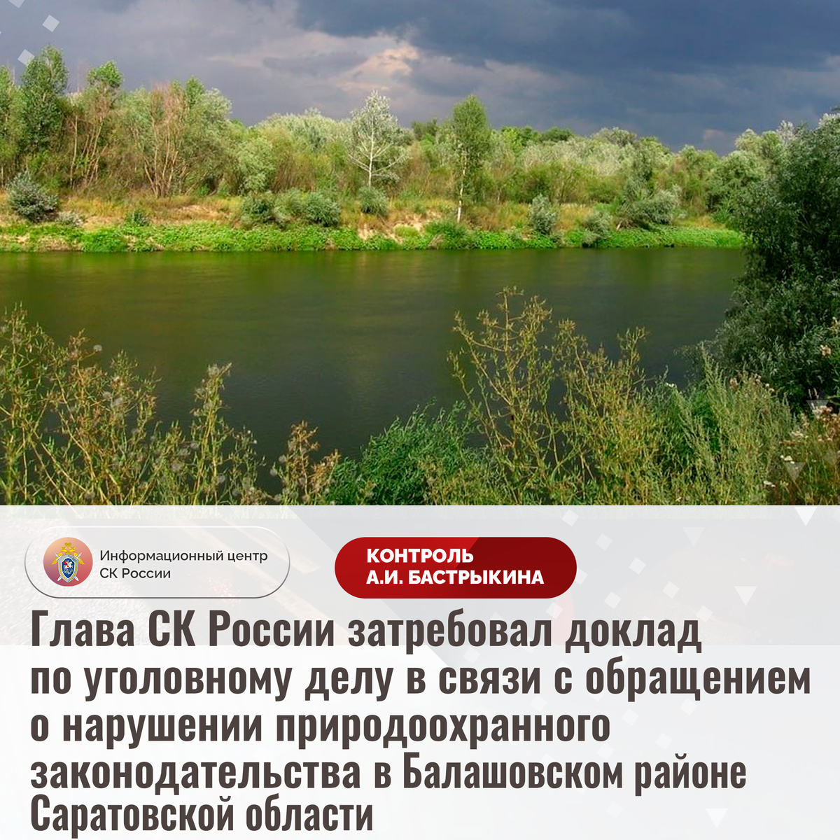 Глава СК России затребовал доклад по уголовному делу в связи с обращением о нарушении природоохранного законодательства в Балашовском районе Саратовской области К Председателю СК России А.И. Бастрыкину через Информационный центр поступило коллективное обращение жителей СНТ «Нива» Балашовского района Саратовской области по вопросу нарушения природоохранного законодательства. Более десяти лет сточные воды канализационной сети сбрасываются в реку Хопёр, загрязняя ее. Поскольку река является источником водозабора, ведение хозяйств затруднено из-за непригодности ресурса для бытовых нужд. Многочисленные обращения в различные инстанции результатов не принесли, модернизация очистных сооружений не осуществляется. В СУ СК России по Саратовской области возбуждено уголовное дело. Председатель Следственного комитета Российской Федерации Александр Иванович Бастрыкин затребовал у руководителя СУ СК России по Саратовской области Дмитрия Александровича Костина доклад о предварительных и окончательных р