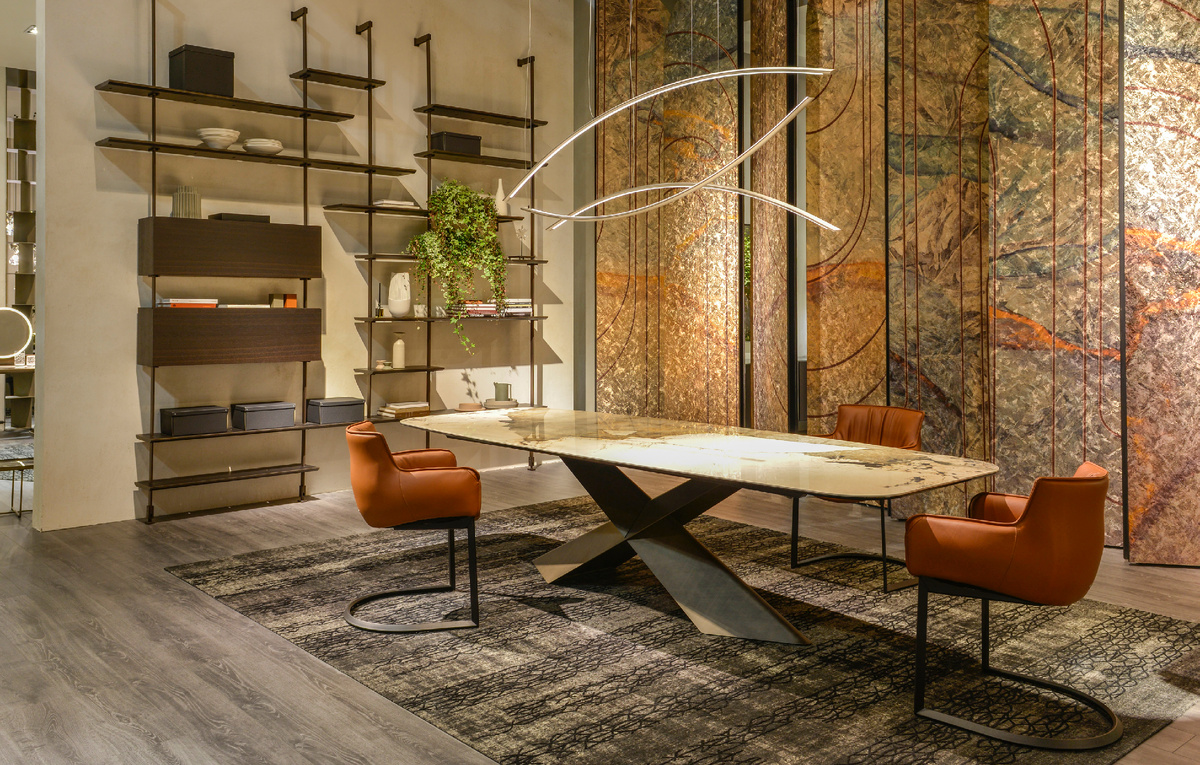 Центральный элемент экспозиции — стол Tyron Keramik с керамической столешницей Corcovado и выразительным основанием Brushed Bronze. Его геометрия поддержана стеллажом Airport с металлическими стойками в отделке Bronze. Кресла Rhonda Cantilever с кожаной обивкой оттенка Barrique добавляют тепла и мягкости, а их изогнутые формы создают баланс с острыми линиями стола. Ковер Mumbai объединяет композицию, подчёркивая тёплую гамму. Светильники Katana Magnum завершают образ — их изогнутые линии и направленное освещение поддерживают динамику пространства. Фабрика: Cattelan Italia