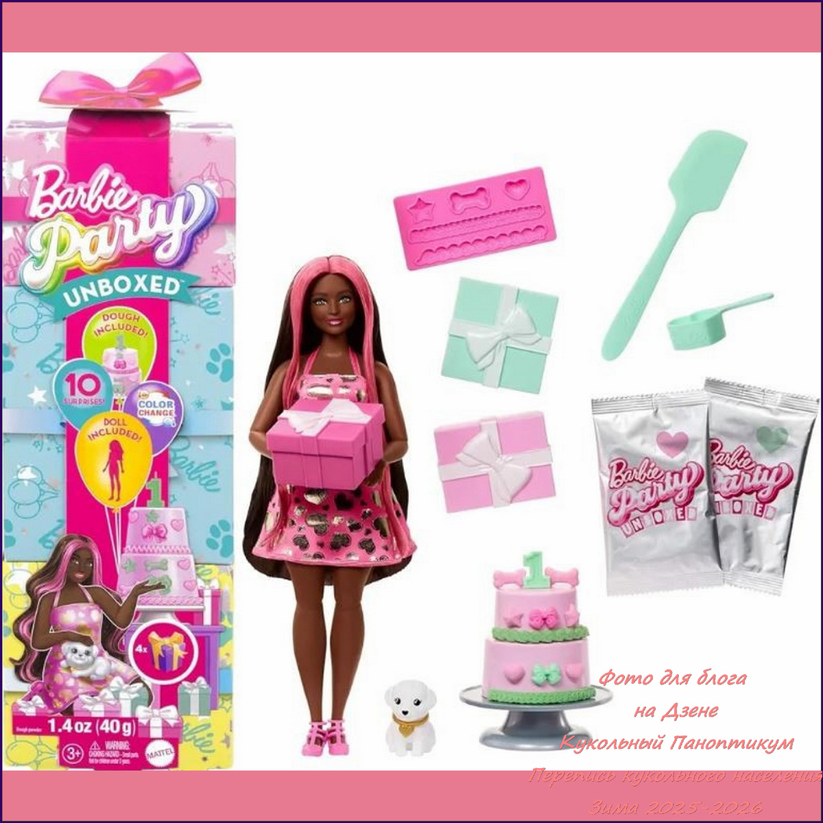 Здравствуйте, дорогие читатели "Кукольного Паноптикума" и случайные гости, зашедшие сюда в поисках волшебства! Эрика приветствует вас, сегодня мы погрузимся в мир праздника, где главной героиней станет настоящая звезда вечеринки — Барби из серии "Party Unboxed". Готовы ли вы разрезать торт, распаковать сюрпризы? I. Барби "Party Unboxed": Вечеринка, которую нельзя пропустить. Эта кукла — воплощение радости, праздника и бесконечных возможностей для игры. Наша героиня — это Барби с темной кожей и длинными, шелковистыми волосами, окрашенными в два цвета: основная часть волос — глубокий черный, а макушка и пряди по бокам — ярко-розовые. Это создает эффектный и современный контраст, который сразу же привлекает внимание. Ее глаза большие, выразительные, мейк с акцентом на розовый макияж, что подчеркивает ее игривый и жизнерадостный характер. Она одета в очаровательное платье-мини розового цвета с принтом в виде сердец и лапок животных, что идеально соответствует теме дня рождения питомца. Пла
