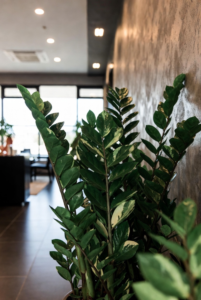 В интерьере замиокулькас работает как архитектурный элемент. Его вертикальный рост, чёткие линии листьев, насыщенный тёмно-зелёный цвет создают визуальную опору в пространстве.