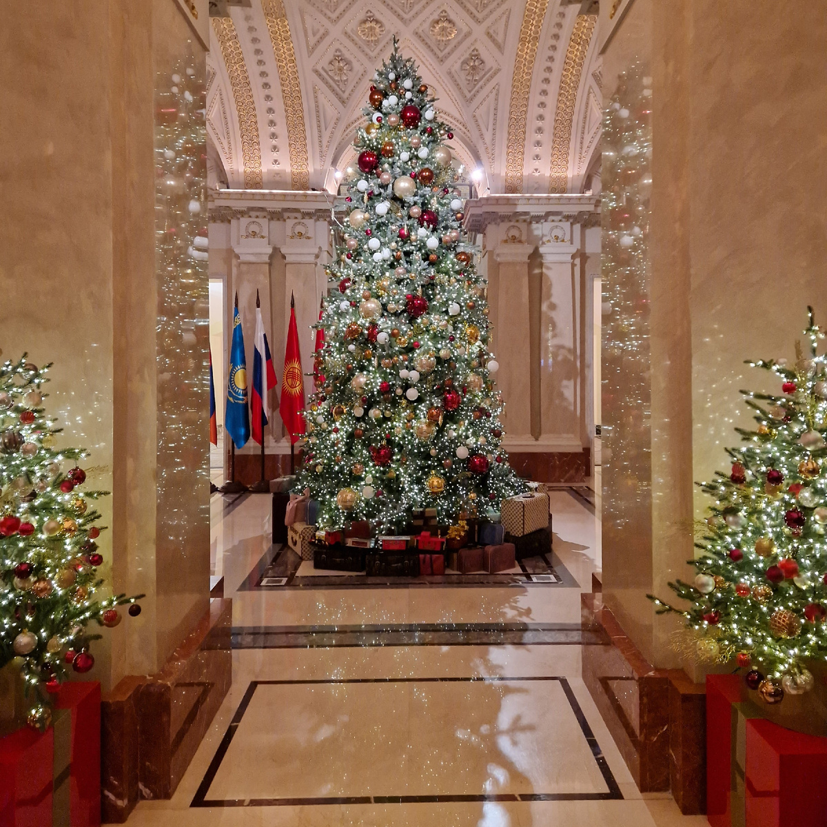 Он считается одним из самых дорогих, и именно там останавливаются разные правительственные делегации, которые приезжают на различные мероприятия. Вот как раз только прошел Неформальный саммит стран СНГ. И на днях видела посты в соцсетях из этого отеля президента Армении Пашиняна. Всё, конечно, очень красиво: ёлочки, новогодние локации. На входе радушно приветствуют, приглашают и т.п. Самая большая ёлка в главном холле. По коридору ещё с десяток маленьких деревьев и еловые гирлянды на стенах и потолке. Есть классная локация для фото с небольшой ёлкой, а под ней коробки подарков и чемоданы. В ресторане тоже красивая ель с крупными игрушками. Когда попадаешь в такую красоту, то и на сервис строишь высокие ожидания. А вот они