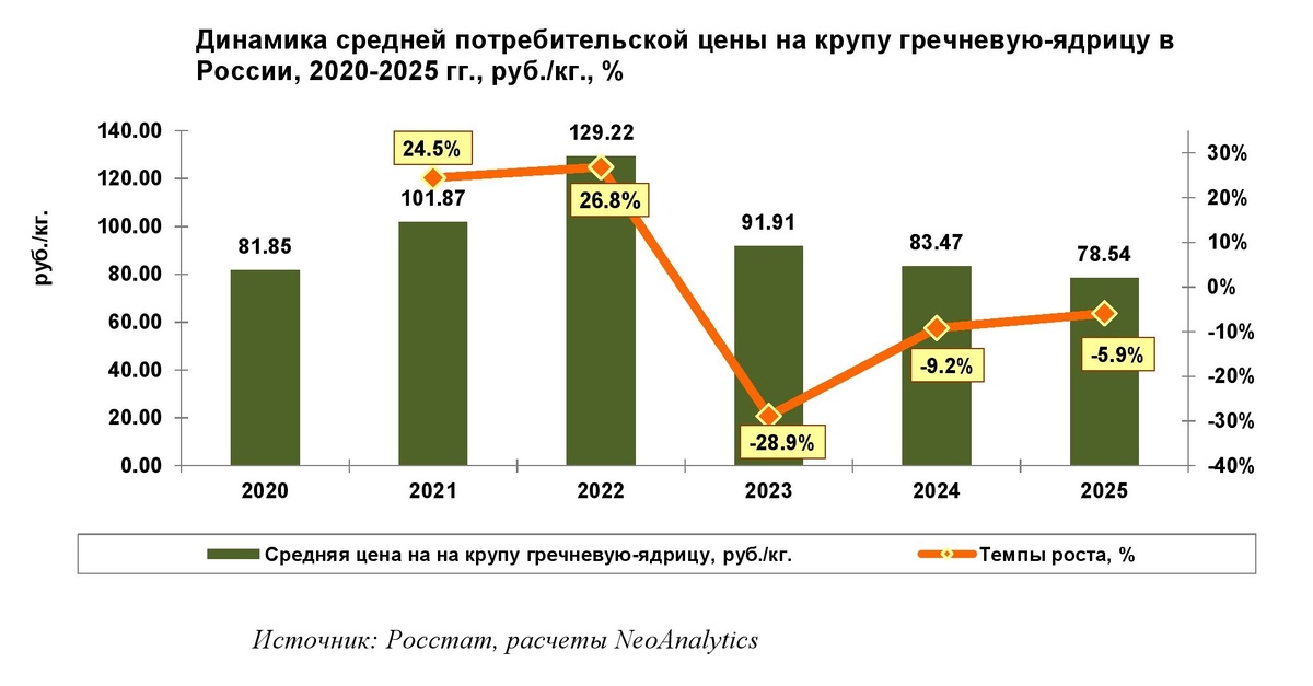 В ходе ежемесячного мониторинга розничных (потребительских) цен на крупу гречневую-ядрицу, проведенного NeoAnalytics, выяснилось, что на основании данных официальной статистики в 2025 г. средняя потребительская цена сократилась на 5,9% по отношению к аналогичному периоду годом ранее и составила 78,54 руб./кг. В 2024 г. средняя цена в России была зафиксирована в районе 83,47 руб. за кг.