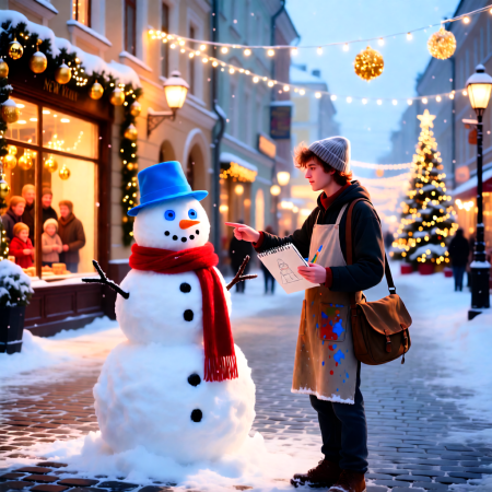 В самый разгар новогодней суеты, когда в городе уже пахло мандаринами и имбирными пряниками, а на площадях включали огни, которые мерцали ярче звёзд, в одном тихом переулке Петербурга художник по имени Артем вышел рисовать. Не на холсте, на снегу. Он не был знаменит, не выставлялся в галереях и жил в крошечной мастерской под крышей, где зимой было холодно, а летом жарко.