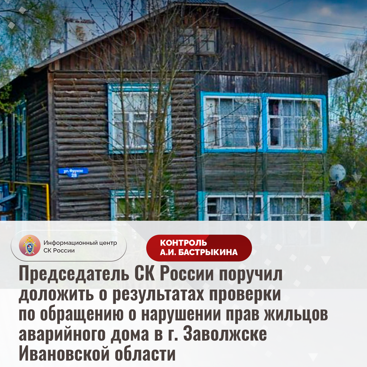 Председатель СК России поручил доложить о результатах проверки по обращению о нарушении прав жильцов аварийного дома в г. Заволжске Ивановской области В Информационный центр СК России поступило обращение жительницы Ивановской области по вопросу длительного нерасселения жильцов многоквартирного дома на улице Фрунзе в городе Заволжске. В 2021 году деревянное двухэтажное здание, введенное в эксплуатацию более 85 лет назад, признано аварийным ввиду высокой степени физического износа конструкций. Однако до настоящего времени благоустроенное жилье собственникам не предоставлено, сроки расселения не сообщены. Обращения в уполномоченные органы результатов не принесли. Указанная ситуация освещалась в сети Интернет. В СУ СК России по Ивановской области организована процессуальная проверка. Председатель Следственного комитета Российской Федерации Александр Иванович Бастрыкин поручил руководителю СУ СК России по Ивановской области Дмитрию Аркадьевичу Позовскому доложить о предварительных и окончат