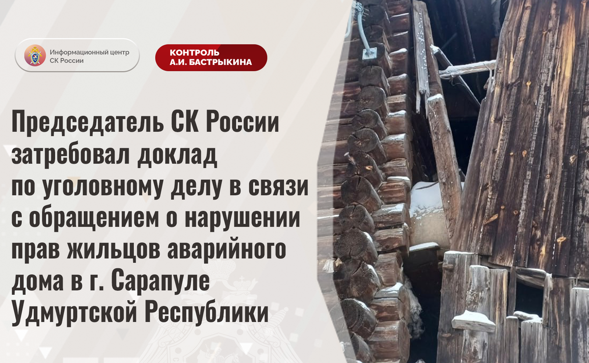 Председатель СК России затребовал доклад по уголовному делу в связи с обращением о нарушении прав жильцов аварийного дома в г. Сарапуле Удмуртской Республики В аккаунте приемной Председателя СК России А.И. Бастрыкина в социальной сети «ВКонтакте» поступило обращение по вопросу несогласия с ходом установления обстоятельств нерасселения жильцов многоквартирного дома на улице Карла Маркса в городе Сарапуле Удмуртской Республики. Фасад, кровля и несущие конструкции здания 1964 года постройки разрушаются, системы водоснабжения в зимний период промерзают, горячая вода, канализация, централизованное отопление и санитарные узлы отсутствуют. Несмотря на признание строения аварийным в 2021 году, до настоящего времени благоустроенное жилье гражданам не предоставлено. Многочисленные обращения в компетентные органы результатов не принесли. В СУ СК России по Удмуртской Республике с января текущего года расследуется уголовное дело. Председатель Следственного комитета Российской Федерации Александр Ив
