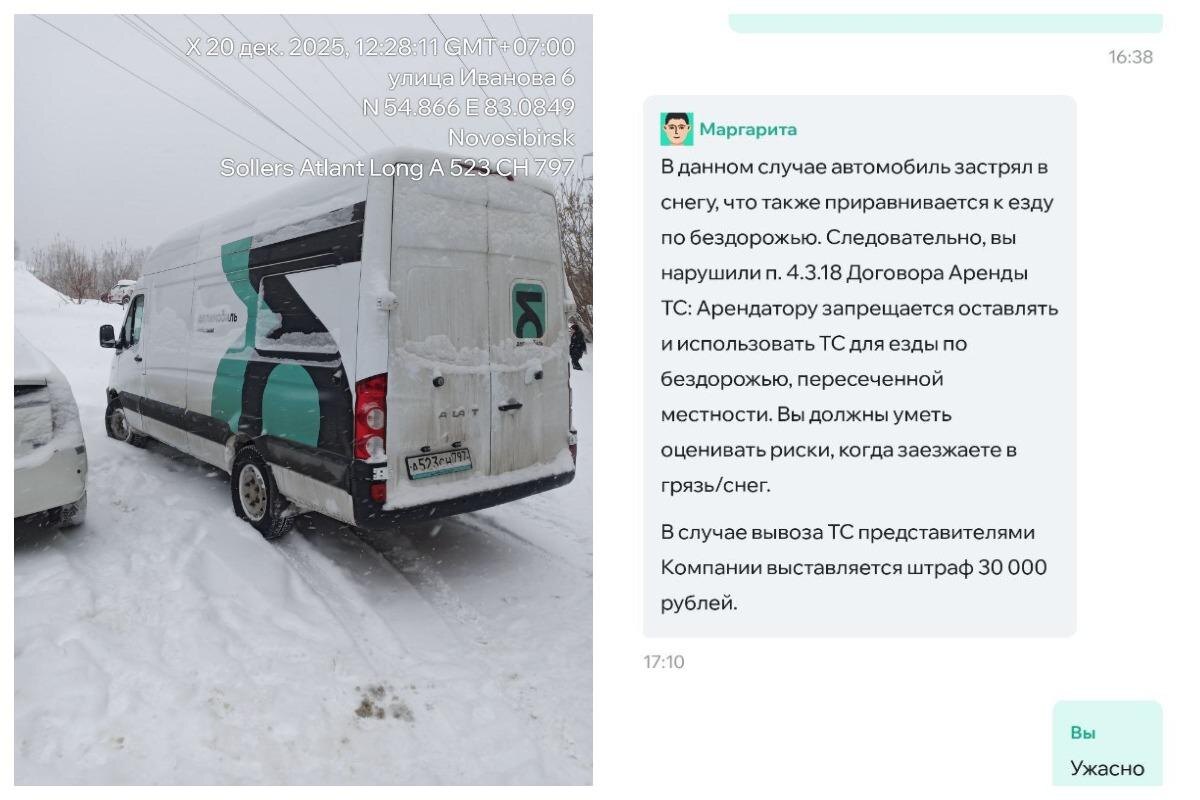 В неприятную историю попал житель Академгородка Иван Сковпин. Он арендовал грузовое авто в «Делимобиле», убедился, что для его целей техника не подходит и оставил ее на парковке у жилого дома. Вскоре ему пришло требование об оплате 30 000 рублей «за езду по бездорожью». Подробности в материале Сиб.фм. «Мне нужно было перевести вещи из моего гаража. Для этого я взял в аренду российский аналог Форда Транзит (Sollers Atlant Long) у «Делимобиля». Я поехал в сторону гаража и заметил, что во время движения по асфальту автомобиль буксует, срабатывает система АБС. Накануне был сильный снегопад и дороги в гаражном кооперативе не были чищены. Автомобиль забуксовал, мы его откопали и поняли, что нам такое не подходит для нашей задачи. Тогда я поехал к парковке рядом с офисным зданием на Иванова, 6 и завершил аренду по всем правилам, сделав обзорные фотографии», — рассказал Сиб.фм Иван. Бесполезная поездка стоила чуть больше тысячи рублей.23 декабре мужчине в приложении пришло требование об оплате
