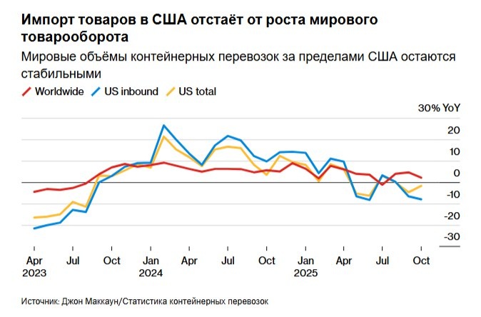 новыми вызовами для стабильности и роста. В 2025 году торговля товарами по всему миру шла относительно хорошо, даже несмотря на то, что президент США Дональд Трамп начал возводить тарифную стену вокруг крупнейшей экономики мира. Данные, на которые на этой неделе сослался ветеран судоходной отрасли Джон Маккаун, показывают, что в октябре мировые объёмы контейнерных перевозок выросли на 2,1% по сравнению с предыдущим годом. Однако за общей устойчивостью скрываются изменения: в США наблюдалось сокращение входящих потоков на 8 %, в то время как импорт в Африку, на Ближний Восток, в Латинскую Америку и Индию демонстрировал уверенный рост. «Мировые цепочки поставок контейнеров уже начали адаптироваться и перестраивать схемы торговли», — написал Маккаун в аналитической записке в понедельник. После того как в 2024 году в США за весь год объём импорта контейнеров вырос на 15,2 %, «будет преуменьшением сказать, что в 2025 году ситуация будет диаметрально противоположной». По словам Маккоуна,