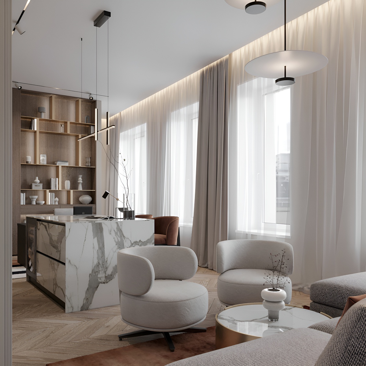 Философия: «Меньше значит больше». Чистый интерьер без лишнего декора, с акцентом на качество материалов и дизайн мебели.