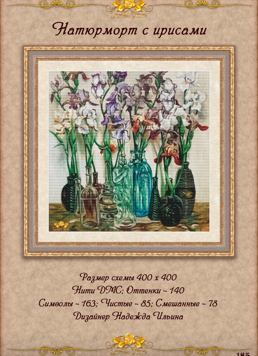 Если не считать проект от Белоснежки на 90 цветов, то Натюрморт с ирисами моя первая серьёзная многоцветка. Для меня было открытие, когда в 20 году случайно я увидела видео "Сто вышитых картин", и увы, это не точное название, о многоцветках. Да, прогресс не стоит на месте. И примитивная вышивка, с помощью компьютерных технологий, преобразилась в многоцветную. Посмотрела много видео об организации такого сложного процесса, о выборе сюжета, материалах. И решилась... Основа - Аида 18 ct, от Гамма, ниточки мулине Royale. Чтобы понять, смогу ли я вышивать сложную работу, остановилась на комплектующих "эконом" класса. Специально, посмотреть многоцветки и "поводить носиком" поехала на Формулу Рукоделия. Вдохновилась Натюрмортом от Белых Кроликов А когда посмотрела предложения дизайнеров в группе ВК, остановила свой выбор на аналогичном сюжете от Надежды Ильиной, с акцентом на зелёную гамму. Первые крестики вышивала по бумаге С февраля 22 года программа Paradise, стала помощником. Как мы з