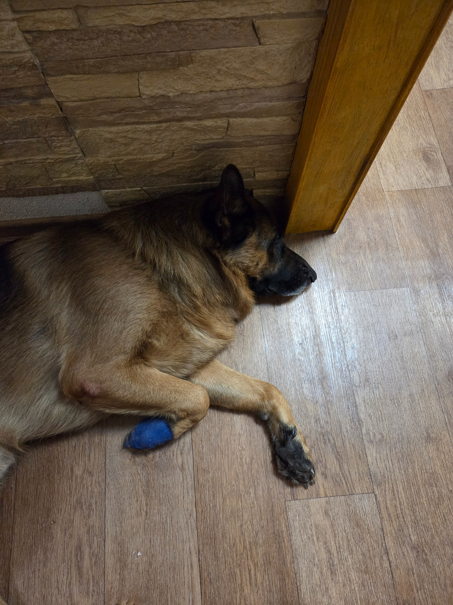 Но нет. В прошлое воскресенье Рекс скакал как конь и все было хорошо. Ближе к 6 вечера заскакал дома так, что стало понятно, надо вести в туалет. Пробрало его. Непонятно от чего. А к 8 вечера начал скакать на трех лапах, поджимая переднюю. Стали смотреть, что там с ним. Ничего сверх страшного не нашли. Только подушечку то ли сгрыз, то ли сама треснула. Обработали, мазью намазали, забинтовали. Но судя по всему, болит сильно. На лапу Рекс почти не наступает и дёргает ею, когда лежит на боку. Такого не было даже тогда, когда он лапу стеклом порезал.